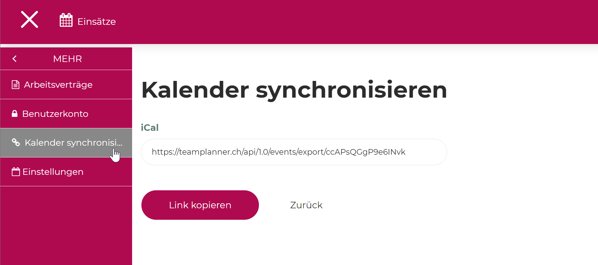 Sous "Plus", vous trouverez le lien pour synchroniser vos interventions avec votre calendrier.